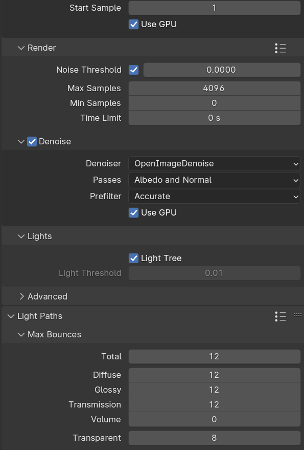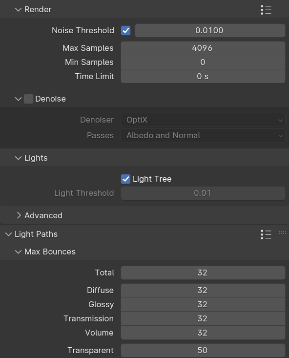 Et j’ai changé le Noise Threshold à 0.00001 pour la deuxième version avec lumière au plafond.